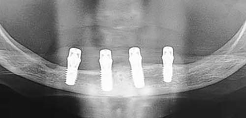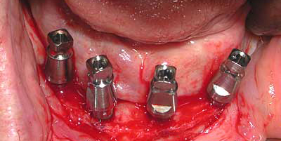 可撤式のインプラント義歯の形態は普通の義歯と変りませんが、御自分ではずせる事から清掃が比較的容易で、これからの高齢化社会にむいたものといえます。インプラントの本数は2-4本の間できめており、必ず4本必要ではありませんが現在、手術後1週間でインプラント義歯が入るのは4本植えた場合のみです。